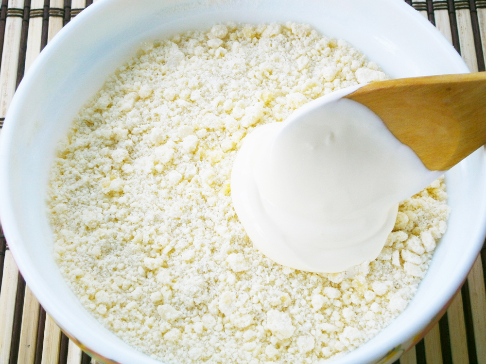 4. Подмешайте к подготовленной массе сметану и замесите мягкое, эластичное тесто.